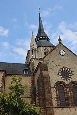 - une flèche en bois recouverte d'ardoise. Elle a été restaurée en 1954. Une petite galerie a alors été rétablie au tiers de la hauteur.