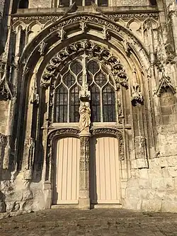 - La statue de la Vierge à l'Enfant est en pierre polychrome, et veille sur les fidèles depuis son socle en haut du mur occidental du clocher, abrité sous un dais architecturé flamboyant. Elle mesure 150 cm de hauteur, et est sculptée en ronde-bosse, mais son revers est plat. La datation est du XVIe siècle, mais la polychromie actuelle est le résultat d'une restauration du XIXe siècle. La Vierge est couronnée, et porte l'Enfant sur son bras droit tout en lui soutient les pieds de sa main gauche. L'Enfant regarde sa mère, et tenait sans doute un objet aujourd'hui disparu dans sa main droite, où une cassure est visible. Le classement de la statue remonte à novembre 1912[27].