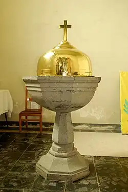 Le baptistère, dans l'axe du collatéral sud, abrite des fonts baptismaux de forme octogonale.