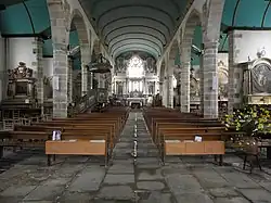 Le vaisseau central, du type à nef obscure, est lambrissée en berceau surbaissée ; les grandes arcades en plein cintre sont supportées par des piliers octogonaux à chapiteaux et leurs clefs de voûte sont ornées de fleurs de lys sculptés[1].