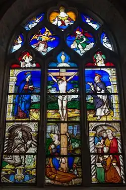 La verrière représente saint Jean et Marie de part et d'autre du Christ en croix, avec deux donateurs, le père André Rapicault et la donatrice Jeanne d'Harcourt.