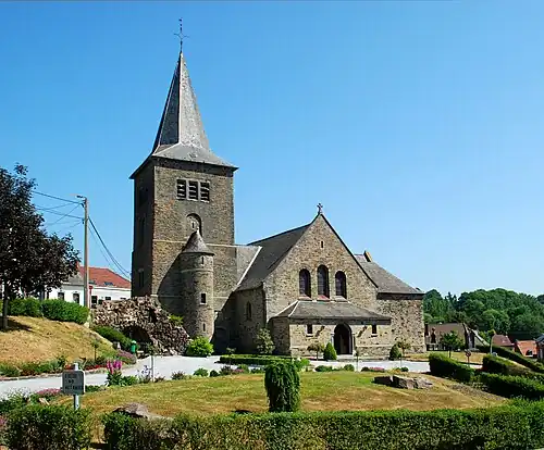 L'église, édifiée en moellons de grès schisteux[3] et couvertes d'ardoises, présente une orientation particulière : le chevet est « orienté » au nord (vers la rue Jules Tarlier) et la façade principale au sud (vers la rue de Sart).