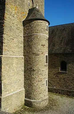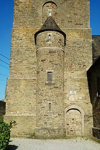 Sur sa face sud, la tour est flanquée d'une tourelle à soubassement en saillie et toiture conique, percée de deux meurtrières et d'une étroite fenêtre aux piédroits harpés. Pour rappel, cette tourelle est récente et date du XXe siècle.