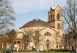 La bibliothèque du Bade-Wurtemberg, construite en face entre 1984 et 1991, fait référence à l'église de Weinbrenner à travers des éléments de colonne et un toit en dôme au-dessus de la salle de lecture principale.