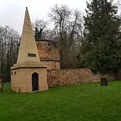 Devant l'entrée de l'église se trouve un colombier datant du XVIIIe siècle en grès et meulière ainsi que le mausolée en grès, de forme pyramidale, de Joseph Pierre de Marson datant de 1828.