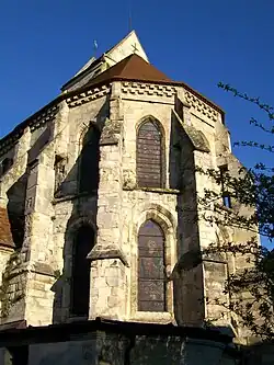 Le chevet est particulièrement remarquable, mais malheureusement mal visible car donnant sur le jardin du presbytère, fermé au public. La partie inférieure des contreforts est plus massive, et la partie supérieure est ajourée pour permettre le passage d'une étroite galerie de service, destinée à l'entretien des baies du second niveau. Ainsi, ces contreforts s'apparentent aux arcs-boutants du premier type. Leur glacis final se situe en dessous du sommet des murs, et il supporte un second contrefort de très petites dimensions. Les murs se terminent par une double corniche de corbeaux. La superposition de deux baies sur les pans de mur du chevet est une disposition assez rare, résultant sans doute du renoncement à un déambulatoire, tout en voulant imiter l'élévation des grandes églises gothiques de la première période. Toutes les baies sont en tiers-point et à lancette simple, et seules celles du rez-de-chaussée sont discrètement décorées d'un archivolte extérieur, ce qui résulte en deux ébrasements successifs.