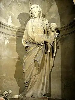 - La statue de la Vierge à l'Enfant, en pierre calcaire, mesure 190 cm de hauteur, et date des alentours de 1720. Elle est abritée dans la niche du retable du chevet de la chapelle de la Vierge Marie, dans la dernière travée du bas-côté nord. Le retable est de style classique, mais il date probablement seulement du début du XIXe siècle, quand la chapelle fut refaite. La clé d'arc arbore un cartouche sous la forme d'un cuir découpé, qui sert de cadre à la guirlande qui entoure les initiales MA. Au-dessus, un large panneau porte l'inscription AVTEL PRIVILEGIE. La niche est cantonnée de deux pilastres doriques partiellement cannelés, qui supportent chacun une section d'entablement ornée de biglyphes à gouttes, et l'amorce d'un fronton triangulaire couronné d'une boule. Les deux segments du fronton brisé flanquent une petite attique confortée par deux ailerons, et surmontées de deux autres ailerons qui esquissent un petit fronton sommé d'un crucifix. Ce retable serait en marbre. La statue, de très grande qualité, est une œuvre originale, qui sort d'un atelier de renom de la capitale. Le sculpteur devait être un contemporain de Robert Le Lorrain (1666-1743), et fut probablement formé à l'école de François Girardon (1628-1715). Une version plus petite de cette Vierge à l'Enfant existe dans l'église du Plessis-Robinson. L'œuvre est classée depuis juillet 1912[11],[20].