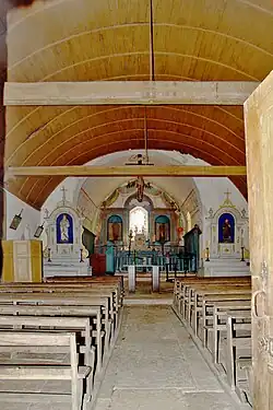 On accède à la nef unique par un narthex éclairé à droite par deux baies géminées en plein cintre. Cette nef recouverte de laves dont plafond de bois est en coque de bateau inversé n'est éclairée qu'à droite par quatre fenêtres hautes, étroites et cintrées. Le chœur, voûté en plein cintre et surplombé d'un clocher-campanile à double arcade protégé par un toit de merrain, est éclairé par une fenêtre à linteau triangulaire.