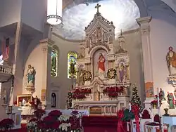 Le père Mazzuchelli dessine les plans d'un bâtiment à deux étages comprenant l'église et la résidence du prêtre. L'ensemble est consacré par Mgr Mathias Loras, le . Il est construit en briques de Davenport que l'on commençait à fabriquer. On y trouvait également une école, une cour de justice, la salle municipale, etc. et la cloche sonnait non seulement pour les messes, mais également pour les incendies, les heures de classe et les réunions municipales. Elle avait une petite chorale où chantaient Le Claire et le juge Mitchell qui offrit ensuite une parcelle de terrain pour y aménager le premier cimetière paroissial de la ville, et deux autres pour construire deux églises dans les quartiers ouest. Il n'y avait pas d'orgue et l'on chantait accompagné d'un violon, ou bien d'un violoncelle, d'une clarinette ou d'une flûte.