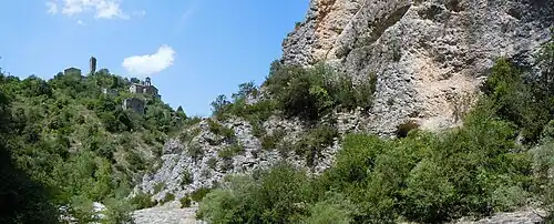 Vue de l'église Saint-Barthelemy et du Château depuis le fond du vallon de Rochecolombe |