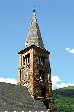 Le clocher carré de style roman lombard est édifié en pierre de taille.