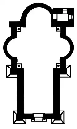 Le côté longitudinal (piedicroce) est greffé sur un presbytère à plan presque carré et couvert d'un dôme, avec deux absides semi-circulaires sur les côtés et une niche rectangulaire voûtée en berceau derrière le maître-autel. Aussi derrière l’autel, y avait-il une abside semblable aux autres, composant ainsi une salle tricora dérivée des modèles de l'antiquité tardive. L'allongement et la modification du chœur remontent à la fin du XVIe siècle. Les niches sont entourées d'arcatures à double virole moulurée, jusqu'à la ligne d'imposition.