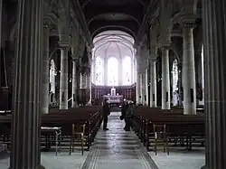 Victor Lalevée[2] dit : « La restauration de 1893-94 a fait de l'église un élégant vaisseau à trois nefs et plafonds plats que supportent de sveltes colonnes en pierre blanche avec chapiteaux de l'ordre ionique. La voûte du chœur à laquelle aboutit la nef principale aux arcs surbaissés est soutenue par de délicates nervures finement sculptées. L'édifice a été consolidé extérieurement par des piliers de soutien en grès rose encastrés dans les murailles ».