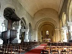 - La chaire à prêcher sculpté en bois de chêne par Collin Claude en 1708, et arborant des bas-reliefs de saint Côme et saint Damien sur la cuve[16] ;