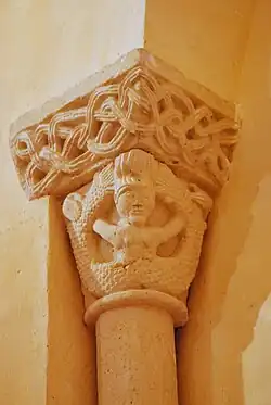 Fenêtre orientale, chapiteau nord : Sirène : On voit sur les deux faces de la corbeille une sirène bicaudale. Ses deux bras retiennent les nageoires en extension et les deux queues se rejoignent derrière sa tête. La nature sexuée de la tentatrice se limite à deux petits seins, sous un visage régulier, coiffé à la garçonne. Elle est logée dans un lieu très symbolique, la fenêtre axiale du chevet, qui oriente l'église vers le lever du soleil. On trouve la même situation aux églises d'Artigues, de Haux, de Lestiac, de Saint-Michel-de-Lapujade, de Saint-Vincent-de-Pertignas et de Sainte-Radegonde.