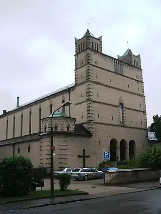 L'église paroissiale, un presbytère et une maison d'infirmières avec un jardin d'enfants devaient être construits. Dans une lettre de 1926, on suppose une paroisse d'environ 3 600 catholiques, "la majorité des ouvriers de l'industrie qui, religieusement froids, sont loin de l'église". Par conséquent, l'accent a été mis sur les salles pour l'éducation des enfants et des jeunes[1],[2].