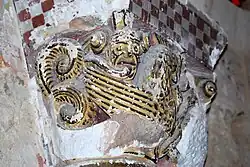 Il s'y trouve quatre doubles chapiteaux à corbeilles figurés. Ils datent d'un reconstruction partielle du chevet au XIIe siècle. Leur iconographie s'inspire de celle de l'abbaye de La Sauve-Majeure. Autour de l'autel, l'endroit la plus sacré de l'église, réservé aux clercs, on trouve des monstres et animaux maléfiques. Dans les églises romanes, l'imagerie réservé aux clercs se préoccupait davantage d'édification morale que de doctrine. Les quatre espèces représentées autour de l'autel : basilic, aspic, lion et dragon sont les quatre ennemis traditionnels de Dieu et de l'Homme — « Tu marcheras sur le basilic et l'aspic, tu fouleras aux pieds le lion et le dragon » (psaume 90) —. Ces bêtes ont été sculptées comme avertissement aux clercs qui servaient deux maîtres, approchant Dieu par le calice tout en restant asservis au Démon, métamorphosé en bête maléfique. L'archange saint Michel est là pour apporter l'espoir au pécheur.