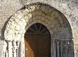 Le portail du XIIIe siècle est pourvu de colonnes, arcatures et colonnettes[6].