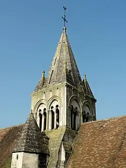 L'étage de beffroi présente sur chaque face deux fenêtres en tiers-point géminées, qui sont séparées par une colonnette appareillée destinée à recevoir, avec deux colonnettes analogues à gauche et à droite, les doubles archivoltes toriques. Comme à Orrouy et Saint-Vaast, chaque baie est recoupée en deux étroites baies, cette fois-ci en plein cintre, et surmontées d'un tympan nu qui repose à son tour sur trois colonnettes. Celle du milieu est libre, raison pour laquelle l'architecte a opté pour une colonnette monolithique. Une partie des tympans et colonnettes a été reconstituée lors d'une restauration assez récente, et les abat-son incompatibles avec les clochers romans ont été retirés côté sud et est. Les minces colonnettes qui ornent les quatre angle de l'étage ont également dû être refaites en partie. La corniche de palmettes est remarquable, mais en partie très érodée ou manquante. Sur chaque face, il y avait initialement dix palmettes groupées deux par deux, disposées entre des têtes grimaçantes. La flèche octogonale en pierre est plus courte que la plupart de ses homologues, et atteint une hauteur de 25 m au-dessus du sol à son sommet. Quatre faces sont percées de deux étroites ouvertures rectangulaires superposées, et de petits oculi rond existent en haut de chaque face. Les pierres de parement comportent en partie un décor de lignes gravées en zigzag. Les quatre angles sont occupées par des pyramidons sur plan carré[24],[27],[26],[23].