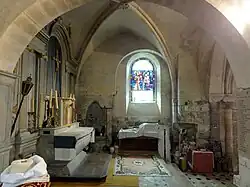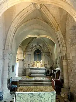 La seconde travée du chœur Saint-Denis se substitue à la seconde travée du chœur roman, qui, comme l'ont avéré des sondages archéologiques lors de la restauration en 1971, était en hémicycle et allait jusqu'aux marches de l'ancien maître-maître-autel. Il était aussi large que le chœur actuel, et les pans de mur près de l'arcade vers la base du clocher proviennent apparemment du chœur roman. Au sud, un décrochement très net existe entre le mur roman et le mur de la seconde moitié du XIIIe siècle, et sans doute pour éviter d'encombrer le chœur, les colonnettes des ogives ont été placées après ces pans anciens, devant lesquels elles ne font pas saillie. Ces colonnettes datent vraisemblablement d'une reprise en sous-œuvre à la fin du XVIe siècle, dans le contexte de la construction du caveau. Celle du nord a été mutilée et la restauration n'a pas été menée à terme, pas plus qu'au sud où le parement du mur manque en partie. Les colonnettes ont été carrément supprimées côté est, de part et d'autre du mur du chevet, sans doute pour la pose des boiseries. De la fin du XVIe siècle date aussi la fenêtre côté sud, qui est en plein cintre et s'inscrit dans un arc de décharge qui fait un peu saillie devant le mur, dont Julie Aycard et Pierrette Bonnet-Laborderie supposent qu'il a également été refait à la même occasion. L'on note une grande piscine liturgique à gauche de la fenêtre. La voûte d'ogives subsiste toutefois de la seconde moitié du XIIIe siècle, et son profil d'un tore en forme d'amande séparé d'un bandeau par deux gorges est de type gothique. Le mince filet au milieu du tore est toutefois inhabituel. La clé de voûte est un disque présentant une fleur à huit pétales festonnées. Les deux travées du chœur Saint-Jean-Baptiste sont voûtées de la même façon et datent de la même époque : ces travaux étaient motivés par l'arrivée des reliques, et l'on peut penser que par la reconstruction du chœur, le seigneur (qu'aucun auteur ne cite nommément) voulait aussi exprimer sa gratitude envers Dieu pour être revenu sain et sauf de Croisade[24],[23].