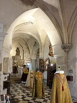 - Les vantaux de l'armoire à reliques dans la première travée du chœur du nord, hauts de 142 cm et large de 58 cm, et datant du dernier quart du XVe siècle. Leur intérêt réside dans les tableaux peints à l'huile au verso. Ils représentent plusieurs scènes de la vie de saint Jean-Baptiste. En commençant à droite, l'on voit de haut en bas : la nativité de Jean et l'imposition de son nom ; les reproches faits par le saint à Hérode pour avoir violé la loi de Dieu en épousant Hérodiade, la femme de son frère ; Salomé apportant sur un plat la tête du saint qui vient d'être décapité, ou le festin d'Hérode ; l'annonce à Zacharie dans le Temple de la naissance d'un fils par l'archange Gabriel ; la rencontre à la sortie du Temple de Zacharie avec Élisabeth ; le Baptême du Christ par saint Jean-Baptiste dans le Jourdain ; et la prédication de saint Jean-Baptiste. Philippe Bonnet-Laborderie estime que l'exécution soignée des détails, le style, l'expression et le mouvement des personnes indiquent un artiste de grande qualité. Étant donné la datation, l'on peut supposer que les vantaux ont été commandés par Philippe de Cuignières lorsqu'il restaura le chœur de la nef septentrionale[32],[33].