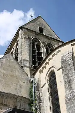 Le clocher, en bâtière, se compose d'un court étage intermédiaire qui évite que ses baies ne soient obturées par les toitures, et d'un étage de beffroi. Les contreforts plats à deux faibles ressauts évoquent une période de construction assez haute, mais comme déjà remarqué, les autres caractéristiques indiquent une date beaucoup plus tardive. On a employé exclusivement de la pierre de taille. Chaque face de l'étage de beffroi est ajourée de deux hautes baies en tiers-point, qui s'ouvrent entre deux colonnettes à chapiteaux, et sous une archivolte torique. Un étroit trumeau sépare les colonnettes des fenêtres voisines, mais les tailloirs des chapiteaux sont continus, et à gauche et à droite de chaque face, ils se continuent jusqu'aux contreforts. Selon une disposition peu courante dans la région, chaque fenêtre est pourvue d'un remplage à deux lancettes, qui sont surmontées d'un quatre-feuilles. Les meneaux sont biseautés, au lieu d'être toriques, et donc dépourvues de chapiteaux, mais possèdent néanmoins des bases sommaires. Il est encore à noter que les baies sont aussi flanquées de colonnettes à chapiteaux vers l'intérieur du clocher, comme parfois les arcades d'un triforium. Le décor est complété par des têtes humaines très saillantes, qui sont au nombre de cinq sur chaque face : trois dans les écoinçons, et deux sur la corniche. Un décor semblable se trouve sur le clocher du Bellay-en-Vexin. La corniche elle-même se compose d'un bandeau chanfreiné et d'un tore. Les pignons du toit en bâtière sont percés chacun d'une ouverture rectangulaire[21].