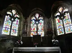 Les vitraux de la fenêtre côté épître (côté droit) sont modernes. Ils racontent la vie de saint Sébastien, jadis titulaire d'une chapelle dans la paroisse[8].