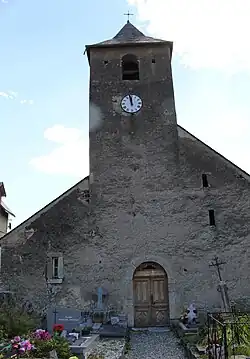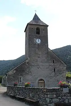 L'entrée se fait à l'ouest par le clocher-porche. L'église possède un mobilier important : des fonts baptismaux sculptés du Moyen Âge, un retable du XVIIIe siècle.