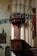 - Ébrasure sud : 1 - une femme à longue robe portant un poisson géant, dont la queue de divise en deux parties ; 2 - un vieillard assis qui se tient la barbe ; 3- un diable embrassant un lion sous la queue (le sabbat).