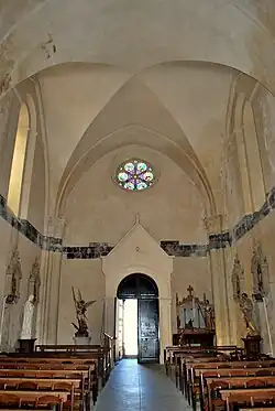 Les chapiteaux de la première partie de la nef portent un décor sculpté, constitué de feuillages. Un arc-triomphal brisé sépare la nef de l'avant-chœur ; deux autres marquent la distinction entre la travée sous-clocher et la nef d'une part, le bas-côté d'autre part. Au revers de l´arc-triomphal de la nef, du côté de l´avant-chœur, on observe les vestiges sculptés d'une ancienne coupole sur pendentifs[6]) : il s´agit d´une corniche et de cinq modillons, le tout à décor feuillagé et végétal. Les vestiges de la coupole apparaissent plus nettement encore au-dessus de la voûte, sous la charpente de l´église.