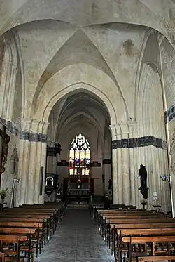 La porte ouest est comprise dans un tambour en pierre (XIXe siècle). Il donne dans la nef par une porte en plein-cintre, surmontée d'un fronton et d'une croix. La majeure partie de la nef et du bas-côté possède une voûte d´arêtes. La voûte du chœur, celle de la travée sous-clocher et enfin celle de la dernière travée du bas-côté sont à ogives. Les clés de voûte du chœur et du bas-côté sont sculptées (feuillage, soleil). Ce recouvrement (daté de 1838), en briques et plâtre, retombe sur d´imposants piliers composés (à l´exception du pilier carré, simple, entre le chœur et le bas-côté ; le pilier à droite de l´avant-chœur est constitué de neuf colonnes). La plupart de leurs chapiteaux sont muets, sous un tailloir en pointes de diamant.