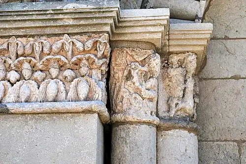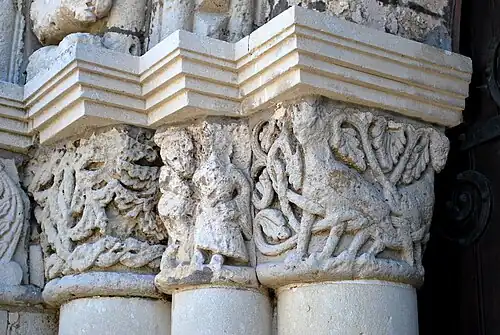 Les voussures des trois portes retombent sur des chapiteaux sculptés. Malheureusement les chapiteaux sont assez érodés et certains sont indéchiffrables. Les tailloirs modernes ont été mis pour tenter de protéger les chapiteaux, qui se dégradent depuis leur protection était enlevé en 1838.
