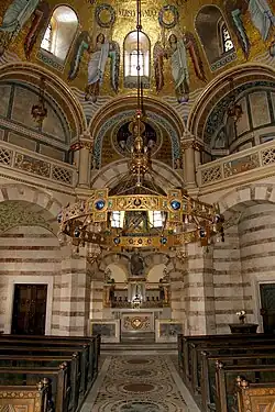 Transept et mur gauche du chœur avec la Vierge en manteau protecteur par Lotte Berger- Portrait en mosaïque d'Elisabeth de Hongrie dans la chapelle Elisabeth
