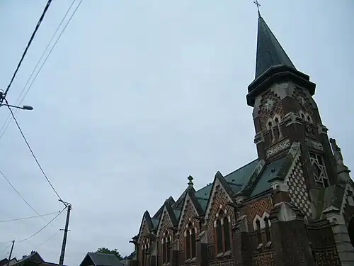 L'église a été reconstruite en brique selon un plan basilical traditionnel, son toit est couvert de tuiles en cuivre. Son aspect extérieur a été particulièrement soigné par l'utilisation de briques rouges et jaunes agencées en damier ou en mosaïque. Le plan et la décoration extérieure et intérieure s'inspirent du style gothique. La décoration intérieure est due pour les vitraux à Gérard Ansart et à l'atelier Darquet. Ils représentent dans la nef, les stations du chemin de croix, dans le chœur la Crucifixion et à la tribune le Christ en majesté. Le mobilier a été dessiné par Pierre Ansart architecte-décorateur amiénois et père de Gérard Ansart. Pierre Ansart est également l'auteur de l'autel décorée de sgraffite.