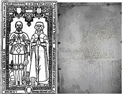 « Cy gist Guillame de Belloy, en son vivant escuier seigneur de Belloy en France Morangle[21] Illes et Fontenelles qui tréspassa le quatriesme jour de septembre mil VC cinquante six. Cy gist damoiselle Anthoinette ... en son vivant femme de feu Guillaume de Belloy laquelle trespassa le XXV ... mil VC cinquante deux. Priez Dieu pour leurs âmes. »