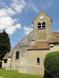Orientée un peu irrégulièrement, avec une déviation de l'axe vers le sud-est du côté du chevet, l'église répond à un plan dissymétrique. Elle se compose notamment d'un double vaisseau de quatre travées de longueur, dont les deux premières correspondent à la nef des fidèles, et les deux dernières au chœur liturgique. Le vaisseau établi dans l'axe du porche d'entrée est le vaisseau central. Le vaisseau du nord (à gauche en entrant) sert de collatéral. La nef carrée est simplement plafonnée ; le chœur également carré est voûté d'ogives. Au sud, plusieurs travées de différente nature sont accolées au vaisseau central. Elles sont en partie plus anciennes que le double vaisseau, et en partie contemporaines, mais ont connu des remaniements. Au sud de la première travée, l'on trouve la chapelle des fonts baptismaux, simplement plafonnée, accompagnée d'une tourelle d'escalier polygonale hors-œuvre. Au sud de la seconde travée, l'on trouve la base du clocher, simplement plafonnée elle aussi, et accompagnée d'un appentis au sud, qui servait anciennement de sacristie[6]. Suit une chapelle d'une seule travée, qui va jusqu'au milieu de la dernière travée du vaisseau central. Cette chapelle est recouverte d'une voûte d'ogives. Pour aligner son chevet sur celui du vaisseau central, une demi-travée a été ajoutée à l'est, qui forme corps avec la sacristie, située plus à l'est. La structure des toitures est assez complexe du côté sud. Le double vaisseau est muni d'une large toiture à deux rampants, avec un pignon en façade, et un pignon au chevet. Le toit en appentis de la chapelle des fonts baptismaux prend appui contre le mur occidental de l'étage intermédiaire du clocher. Le petit local au sud du clocher est également pourvu d'un toit en appentis prenant appui contre le clocher, mais ne dissimule que la partie inférieure de son étage intermédiaire. La toiture du clocher en bâtière est curieusement perpendiculaire à l'axe de l'édifice. La chapelle au sud du chœur possède un toit en bâtière parallèle à l'axe de l'édifice. Enfin, la demi-travée prolongeant cette chapelle et la sacristie sont dotés d'un toit en pavillon.