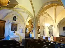 Les voûtes, en arc brisé, sont plus aigües dans le vaisseau central que dans le collatéral. Elles sont toutes les quatre dépourvues de formerets. Les ogives et doubleaux accusent le même profil, conformément à l'usage à l'époque flamboyante. Elles se présentent sous la forme d'arêtes saillantes, comportant de face un filet entre deux fines moulures concaves, et latéralement, un large cavet plus profond, délimité du voûtain par un tore (en lieu et place de l'habituel filet saillant). Les deux clés de voûte du vaisseau central sont pourvues d'un décor sculpté, en l'occurrence une étoile à huit branches dans la première travée, et un cuir découpé entouré d'une guirlande dans la deuxième travée. Les deux clés du collatéral arborent des écussons peints. Au centre, les huit nervures retombent sur le tailloir octogonal du pilier central, profilé d'une plate-bande et d'une doucine. Immédiatement sous le tailloir, le pilier porte une frise de feuillages et de pampres, qui n'est pas d'un très bon niveau. Au milieu de l'élévation ouest, les ogives et doubleaux sont reçus sur un cul-de-lampe, dont la sculpture est abîmée. Au milieu de l'élévation nord, le cul-de-lampe est bien conservé, et n'a rien de flamboyant. Son tailloir en hémicycle n'est pas mouluré. Sa corbeille est sculptée de feuilles simples appliquées. Un autre cul-de-lampe décoré existe dans l'angle nord-ouest du collatéral. Il se présente sous la forme d'une tête sculptée de facture réaliste. Ailleurs, les nervures se fondent simplement dans les murs, ou retombent sur les deux piliers difformes au sud. Quant aux élévations nord et est, elles n'appellent que peu de remarques, sauf que trois sur les anciennement quatre fenêtres sont bouchées, et que l'éclairage par la lumière naturelle est tout à fait insuffisant. Les contours des fenêtres bouchées sont encore visibles à l'extérieur. Au nord, la première fenêtre n'était qu'un oculus. Ici, le prétexte pour sa suppression fut l'installation de la chaire à prêcher. Au chevet, ce sont le retable du maître-autel et le retable de la Vierge qui occultent les fenêtres.