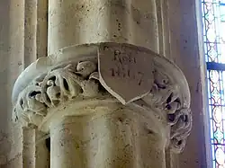 - Base du clocher, chapiteau dans l'angle nord-ouest.