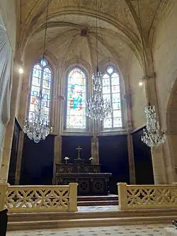 - Le maître-autel est en fonte partiellement dorée, et a été fabriqué par les fonderies Durenne et du Val d'Osne en 1867. Il a été présenté à l'exposition universelle de 1867, à Paris. Son décor architecturé est de style néo-gothique. Le tabernacle est flanqué par des bas-reliefs représentant les trois animaux allégoriques et l'homme ailé du tétramorphe : saint Marc (lion), saint Mathieu (homme ailé), saint Jean (aigle), et saint Luc (bœuf)[13].