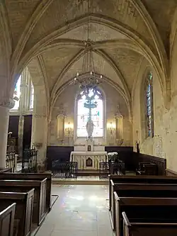 Voûté d'ogives contrairement à la nef, le chœur a la même largeur et la même hauteur que celle-ci, mais les grandes arcades sont moins élevées : la hauteur de leurs piliers ne représente que la moitié de la hauteur des supports des hautes-voûtes. La conséquence est ici une élévation sur deux niveaux, avec l'étage des grandes arcades et un étage de murs aveugles. ll n'y a pas de trace d'éventuelles fenêtres hautes bouchées. Les grandes arcades concernent les deux premières travées du chœur. La troisième travée est l'abside, qui comporte une courte partie droite, délibérément dépourvue de fenêtres sans qu'il y ait une contrainte qui pourrait le justifier, et une abside à pans coupés. L'on y remarque le haut soubassement des fenêtres, qui commencent au-dessus du niveau des chapiteaux des grandes arcades. Cet éclairage parcimonieux, et les boiseries très sombres qui habillent les allèges, sans intérêt artistique, confèrent au chœur un aspect sévère. C'est néanmoins une construction soignée et bien proportionnée. Elle se distingue par la cohabitation des éléments gothiques flamboyants et des éléments de style Renaissance, ce qui n'est pas rare dans les églises de la région, mais ce qui concerne plus couramment des églises reconstruites sous le règne de François Ier ou postérieurement. Les éléments flamboyants sont les frises et le pilier cylindrique reprise en sous-œuvre de la chapelle de la Vierge, au sud ; les piliers ondulés de l'abside, engagés dans les murs, avec leurs chapiteaux ; et les parties hautes du pilier tréflé au nord de l'arc triomphal. Les éléments Renaissance sont les frises du même pilier et du pilier suivant, au niveau des grandes arcades du nord ; et les pilastres et chapiteaux corinthiens de l'arc triomphal et du premier doubleau intermédiaire. Quant au remplage des fenêtres à gauche et à droite de la baie axiale, il est encore plus flamboyant que gothique, avec des meneaux au profil prismatique aigu, et des lancettes en arc brisé. La partie supérieure du réseau est fortement simplifiée, et se compose d'un oculus dérivé du soufflet flamboyant, et de deux écoinçons ajourés qui remplacent les mouchettes flamboyantes. Les voûtes sont flamboyantes par le profil de leurs nervures et par l'arc brisé des formerets, et renaissantes par leurs doubleaux en anse de panier, comme la fausse voûte de la nef[25].