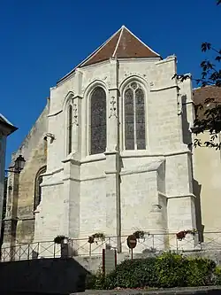Le chevet adopte le plan le plus courant à la période gothique, mais il présente deux caractéristiques anormaux. Il s'agit, premièrement, de la forme des contreforts, qui sont strictement verticaux et s'achèvent par un chaperon, comme fréquemment à la Renaissance, alors que les chaperons sont peuplés de chimères typiquement flamboyants : cet enchevêtrement des deux styles ne peut guère s'expliquer par une simple interruption du chantier. Une possibilité serait que les chimères auraient été sculptées quelques dizaines d'années avant l'achèvement du chœur, qui se situe au milieu du XVIe siècle comme l'indiquent les chapiteaux corinthiens et les doubleaux en anse de panier visibles à l'intérieur. La deuxième particularité est le soubassement de plan carré, qui conviendrait à un chevet plat. Aucun détail n'indique si le chœur primitif était effectivement à chevet plat, et si le soubassement est un vestige de la précédente église. Il peut tout aussi bien avoir été jugé nécessaire pour parer au risque d'un glissement de terrain, du fait de l'implantation de l'église sur un terrasse, en surplomb de la rue. Dans les angles arrondis du soubassement, des chapiteaux corinthiens fortement mutilés sont encastrés. L'on ignore s'il s'agit de l'idée d'un restaurateur des années 1860, ou si les chapiteaux témoignent tout au contraire de la postériorité du chœur au reste du gros œuvre. Ils ont pu être sculptés en prévision du voûtement de la nef, qui aurait été définitivement abandonné quelques décennies après son achèvement.