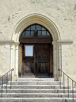 - Dans la base du clocher, le vitrail de la baie septentrionale (n° 9) représente la naissance de saint Jean-Baptiste, qui est le saint patron de M. Bouton (1804-1868, donateur du vitrail[18] (sans illustration).