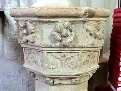 Également au domaine de la sculpture appartient le bénitier face au portail latéral sud. Taillé dans un bloc de pierre calcaire, et placé sur un fût octogonal, il mesure 91 cm de hauteur (avec le pied), 41 cm de largeur et autant de profondeur. Le décor en bas-relief de la cuve octogonale permet une datation du début de la Renaissance. La moitié supérieure de chacune des faces est sculptée d'une rose, et la partie inférieure comporte un panneau affichant une composition végétale, deux anges présentant un blason, deux dragons s'affrontant, deux aigles autour d'une fleur, et le pélican nourrissant son petit de sa propre chair, symbole de l'Eucharistie. Un tore court à la bordure, des baguettes délimitent inférieurement et supérieurement les deux registres, et une frise de feuillages se profile dans l'échine sous la cuve. L'intérieur de la cuve a reçu une doublure en majolique au XIXe siècle. Elle est aujourd'hui cassée. Une couche de peinture blanche, qui recouvre une peinture verte du XIXe siècle, altère la qualité de l'œuvre. Ce bénitier est classé au titre objet depuis [27].
