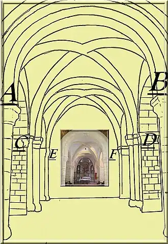 - « de volumineux bourgeons que l'on désigne aujourd'hui sous le nom de crochets »[20], (plan du chœur repères A et C) ; ces crochets terminent l’extrémité des chapiteaux ;