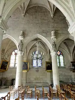 Les murs du second niveau d'élévation ne sont animés par aucun élément de scansion horizontal, et, fait exceptionnel pour une nef conçue d'emblée pour être voûtée (à en juger par l'homogénéité stylistique entre les voûtes et la façade, qui ne permet pas une interruption du chantier significative), la retombée des voûtes s'effectue sur des culs-de-lampe, que rien ne relie visuellement aux piliers des grandes arcades. Les culs-de-lampe sont alternativement de plan rond et de plan carré, sans analogie avec les tailloirs des piliers. Un cul-de-lampe carré au sud fait toujours face à un cul-de-lampe rond au nord, et vice versa, sauf dans les angles, où ils sont tous ronds. Globalement, ils sont moulurés à l'instar des tailloirs et chapiteaux des grandes arcades, mais sculptés de nombreux motifs décoratifs, dont des oves, des feuilles lancéolées et des feuilles d'acanthe. Les culs-de-lampe carrés sont formées par des sections d'un entablement dorique, avec une rose ou patère à ombilic sur la métope, et un rang d'oves de différente nature sur l'architrave, dans l'échine de la corniche, et sur le bandeau supérieur de la corniche. Il n'y a pas de correspondance avec les consoles qui supportent les statues du portail. Sauf au revers de la façade, les voûtes sont munies de formerets d'un profil assez complexe, propre à la Renaissance. Les ogives et les arcs-doubleaux partagent un même profil prismatique aigu, encore typiquement flamboyant. La première clé de voûte est un disque sculpté d'un arrangement végétal. Les trois autres sont pendantes, et affichent un décor de motifs de la Renaissance, dont notamment des oves et des grecques. Elles se terminent par un bourgeon suspendue. Toutes les voûtes sont établies sur des croisées d'ogive simples, sans nervures supplémentaires. Louis Régnier loue néanmoins l'élégance de ces voûtes[7]. Mais malgré les clés et culs-de-lampe sculptés, la nef serait un peu bancal sans aucun autre élément de décor. C'est pour cette raison que le maître d'œuvre a ménagé une niche à statue au-dessus de chaque pilier, et dans chacun des angles. L'on ne parvient pas au chiffre de douze, et les niches ne pouvaient donc pas abriter les Douze Apôtres, comme à Serans, où il y a deux niches par pilier, mais aucune dans les angles, ou à Vétheuil, où les niches sont prises dans les piliers. Les consoles se situent au niveau des tailloirs des grandes arcades, et adoptent leur profil. Ce qu'il y a de remarquable dans les niches sont leurs dais, qui sont architecturés et prennent la forme d'édicules à l'antique ou petits temples. La diversité de la mise en œuvre est assez grande, et l'on retrouve plusieurs ordres. Le point commun est toujours un premier ordre qui se résume aux chapiteaux, à l'entablement et à la voûte, et un second ordre avec des pilastres ou des colonnettes. Il n'y a curieusement pas de couronnement, mais l'on trouve quelques dispositions originales, dont de petits édicules à frontons s'insérant dans les arcades du second ordre, ou un minuscule obélisque. Les vases Henri II et les volutes sont employés à profusion, mais l'on cherchera en vain des symboles religieux. Reste à revenir sur deux particularités de l'élévation occidentale, où les dais sont reliés aux culs-de-lampe de la voûte par des fûts engagés, qui sont interrompus par l'encorbellement de la coursière sans garde-corps qui permettait de passer des combles du bas-côté nord vers ceux du bas-côté sud.