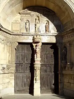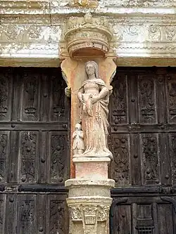 - La Vierge à l'Enfant au trumeau du portail date du milieu du XVIe siècle, et est donc aussi ancienne que celui-ci. La polychromie s'accorde par ailleurs avec celle du dais et de la console du trumeau. La statue mesure 140 cm de hauteur, et est accompagnée d'une petite figure de donateur agenouillée, mais regardant dans la même direction que la Vierge. Les mains du donateur manquent, et son visage est effacé. La tête et le bas des jambes de l'Enfant manquent également. Le classement au titre objet remonte à 1907[22].
