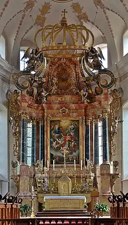 Le maître autel est réalise dans le style baroque romain en 1682. La table d’autel est encadrée de colonnes surmontées d’anges soutenant un baldaquin en forme de couronne. Il était ainsi probablement similaire à celui encore visible à l’église abbatiale d’Ebermunster[7].