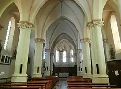 Composée d’un clocher sur la façade principale surmontant le portail d’entrée, l’église est à trois nef voûtées en croisées d’ogive. Son plan est celui d’une croix latine [3].