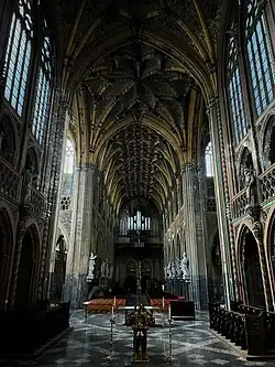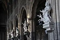 Parmi les éléments les plus remarquables, la nef, véritable dentelle de pierre ; la voûte comptant plus de 150 clés de voûte dans la nef centrale ; les stalles du XIVe siècle ; le buffet d'orgues Renaissance et son instrument en style Renaissance reconstruit par la Manufacture d'orgues Schumacher d'Eupen[3] ; le vitrail avec les armoiries des 32 vieux métiers (XVIe siècle) ; les statues baroques de Del Cour et de son école (fin XVIIe siècle) ; et le couronnement de la Vierge (groupe sculpté du XIVe siècle).