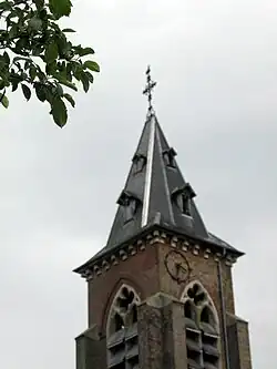 Le clocher de l'église, vu depuis la chaussée de Rouvroy. | ||||